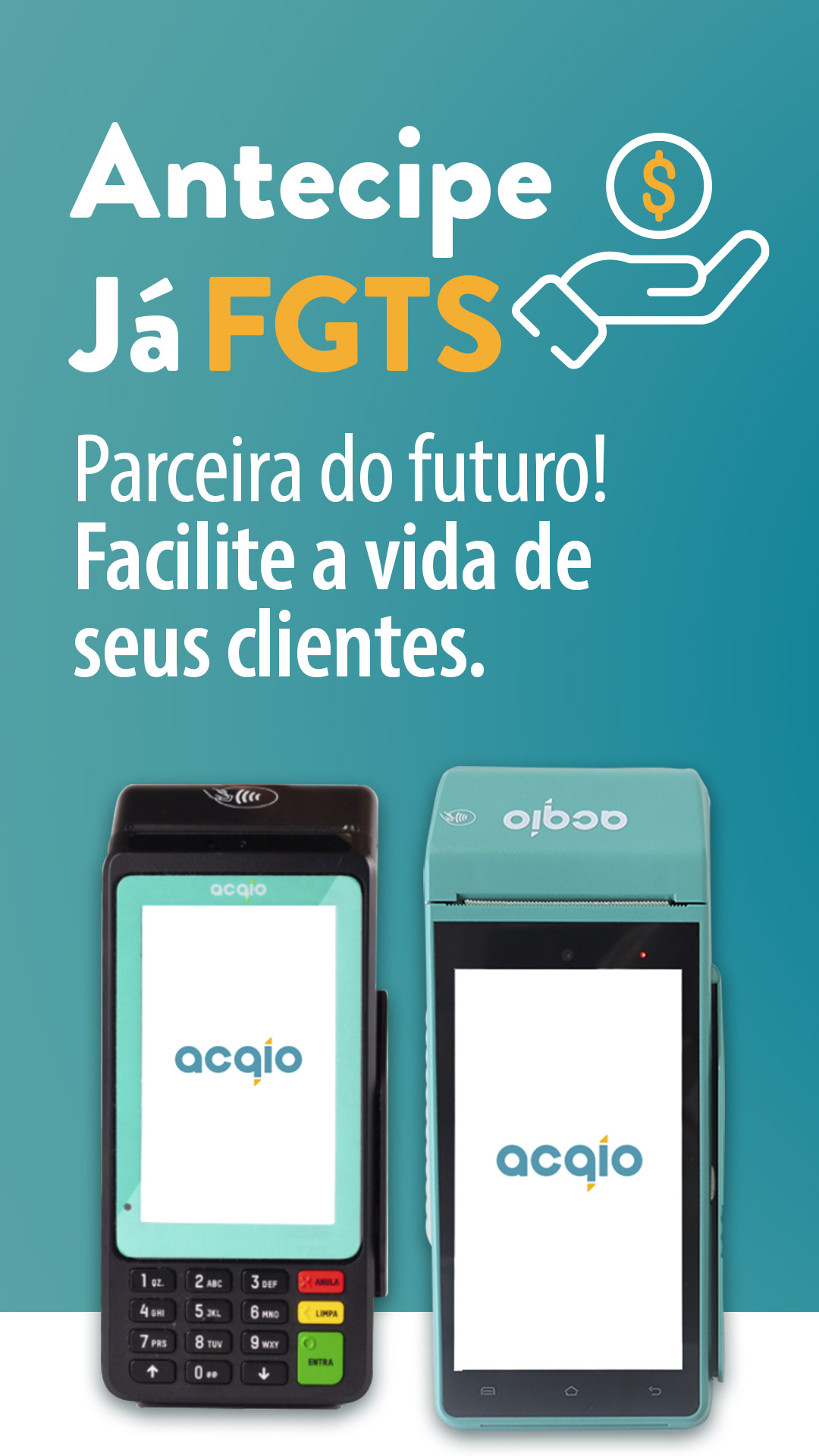 Com o Antecipe Já FGTS, seus clientes podem acessar o FGTS Saque-Aniversário de forma prática e simples, diretamente no seu estabelecimento através da sua Smart POS e ACQIO PRO.